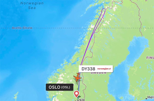 Por motivos de seguridad, la tripulación ha decidido regresar al aeropuerto de origen, Oslo, lo que ha provocado que el avión haya hecho un vuelo de unos 2.000 kilómetros en balde, como se puede ver en la imagen que acompaña a esta información.