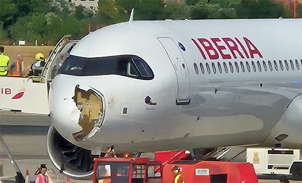 El A321XLR en cuestión declaró emergencia al poco de partir desde el hub madrileño a primeros de agosto. El impacto fue de tal brutalidad que destrozó el radomo, estructura aerodinámica ubicada en la parte frontal de un avión que protege el radar meteorológico, provocando una grieta en el mamparo de presión, que forma parte de la cabina presurizada del fuselaje. El motor izquierdo también sufrió importantes daños.